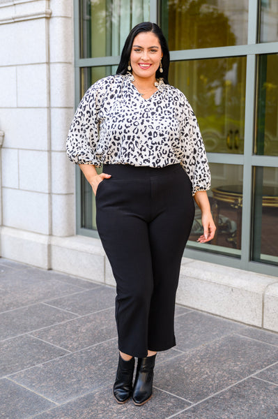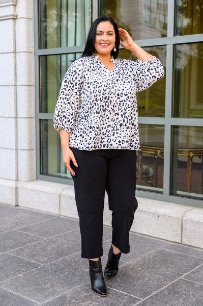 Office looks don't have to boring and the A Bit Of Fun Animal Print Blouse In Black is here to prove that! Pair this chic top with a black pencil skirt, loafers, and some dainty pearls for the cutest office look. Featuring a smocked neckline with notched detail that falls into a flowy bodice, a slight a-line silhouette, and elbow length sleeves with elastic cuffs.