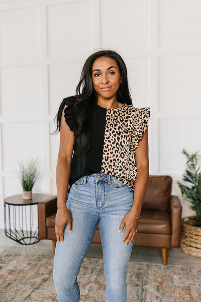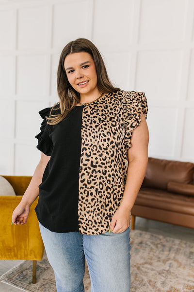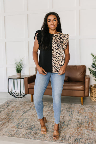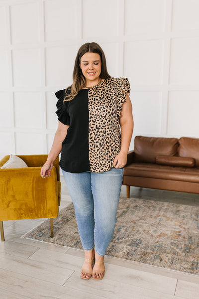 Introducing the A Bit Wild Flutter Sleeve Top! With its bold, eye-catching half black, half leopard design, this top will have heads turning everywhere you go. The smocked ruffle sleeve, keyhole button closure, and side slits provide a beautiful, flattering silhouette that's sure to make you stand out. Unleash your wild side!