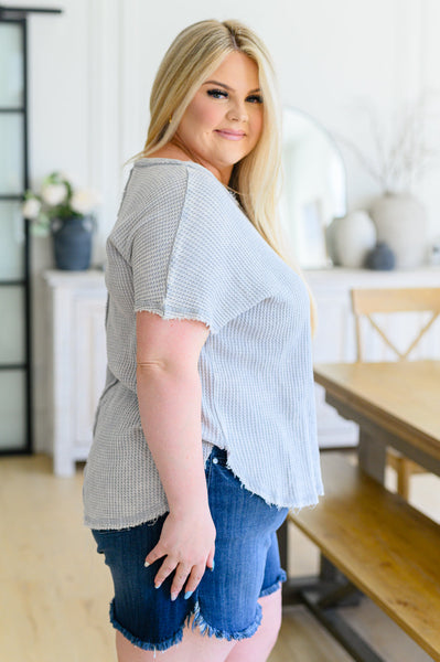 Transform your wardrobe for spring with the A Wink and a Smile Waffle Knit Top. Featuring raw edge details, a round hem, dolman sleeves, and a unique back patch detail, this mineral-washed piece adds unique character to any look.