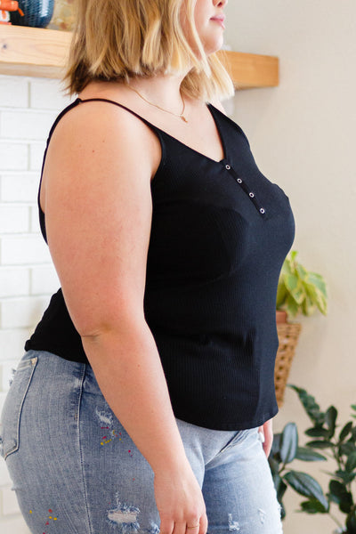 The All Day Ribbed Cami In Black will be here for you any day of the week! Featuring a stretchy ribbed knit that shapes a henley detail scoop neckline. The top is supported by adjustable spaghetti straps with a loose fit bodice that ends at a double rounded hem. This timeless piece will never fail you!