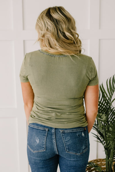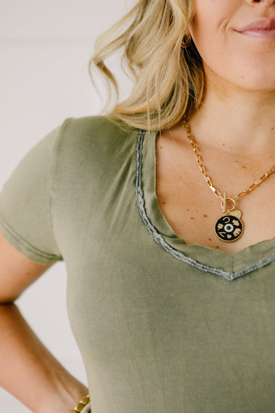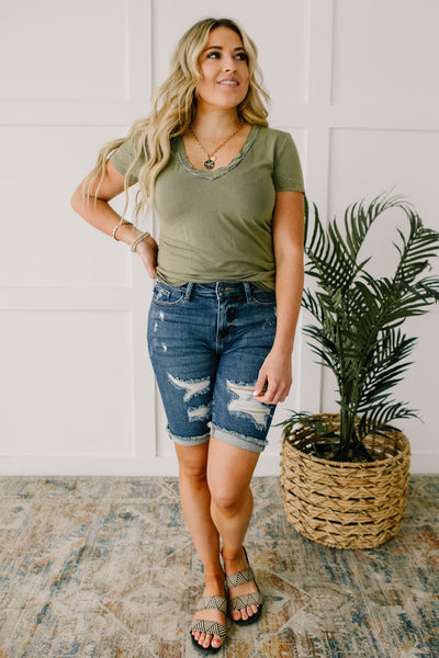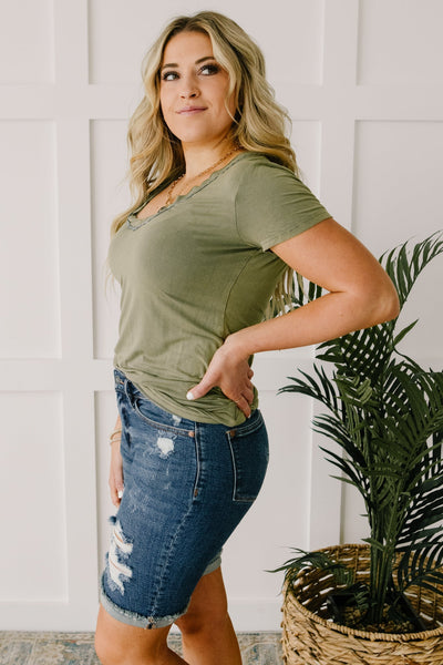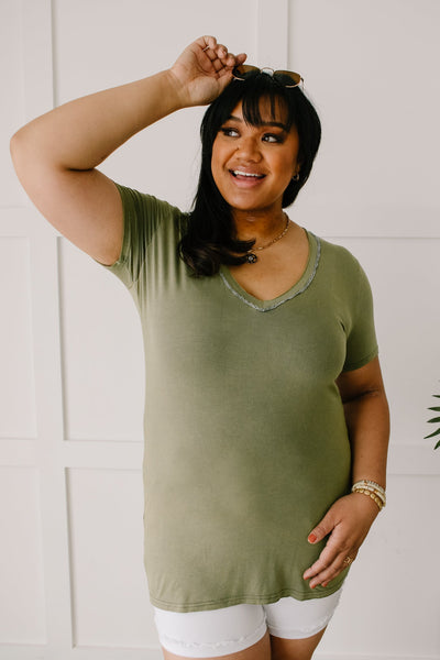 This lightweight top is the perfect piece to wear all season long! It features short sleeves and a v-neckline that is lined by the sweetest lace details. Dress it up by pairing it with a slitted floral skirt or go casual with a pair of biker shorts or jeans.