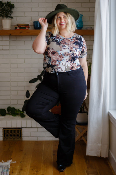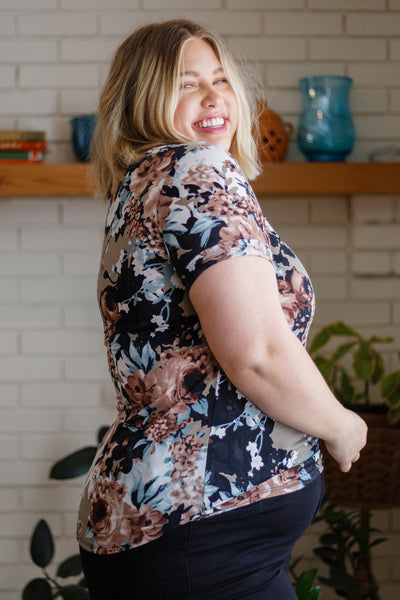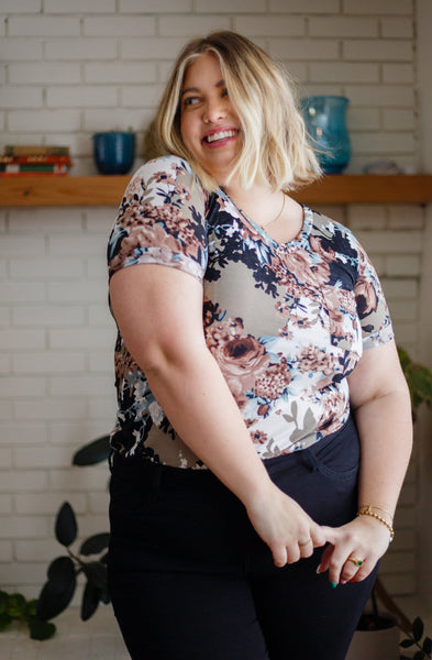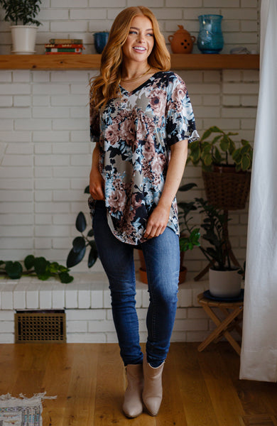 You'll get an A+ for style when you show up in the Baskets Of Flowers Floral Tee! A stretchy, slinky style knit shapes this fun tee, featuring a v-neckline, short sleeves and a loose fit bodice. A front chest patch pocket and a rounded hemline elevate this tee even more!