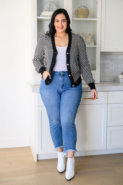 The Big City Nights Checkered Cardigan is the perfect pick for wherever you're headed next! A lightweight, stretchy knit shapes an open front with a functional button placket decorated in faux pearl buttons. A slightly cropped bodice supports long sleeves with puff shoulder detailing and contrasting sleeve cuffs. The checkered print is just another reason why this trendy cardi needs to be in your closet asap!