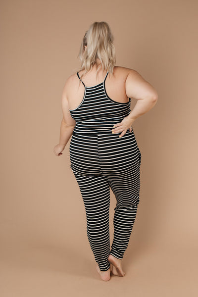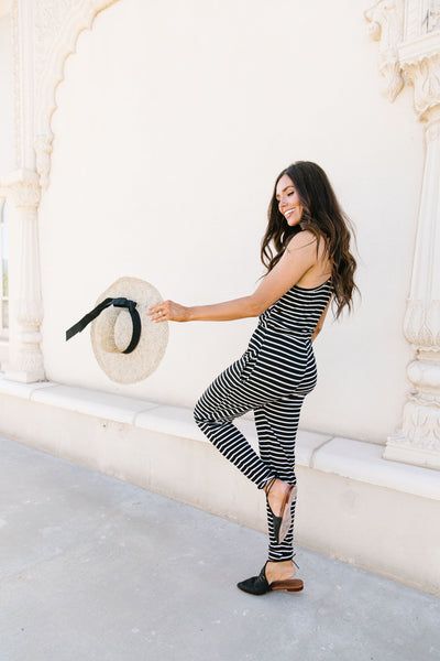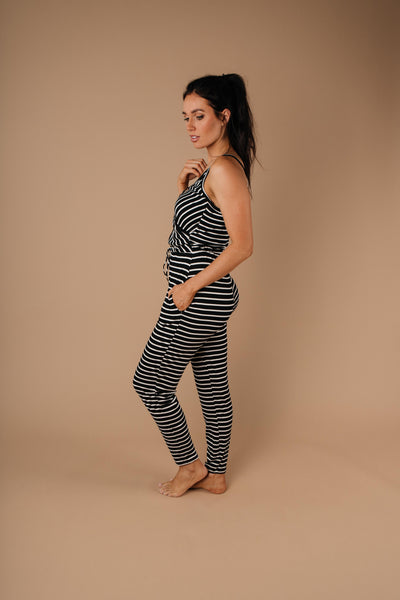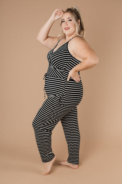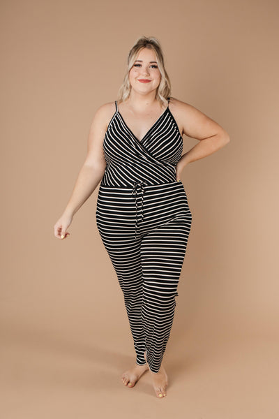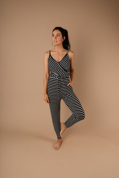 This striped jumpsuit will instantaneously make you feel long and lean! It has a gorgeous plunging wrapped neckline, an elastic waist, and the ever-so-appreciated pockets feature! From date night to lounging, this piece checks all the boxes!