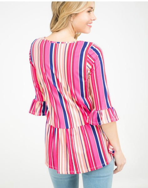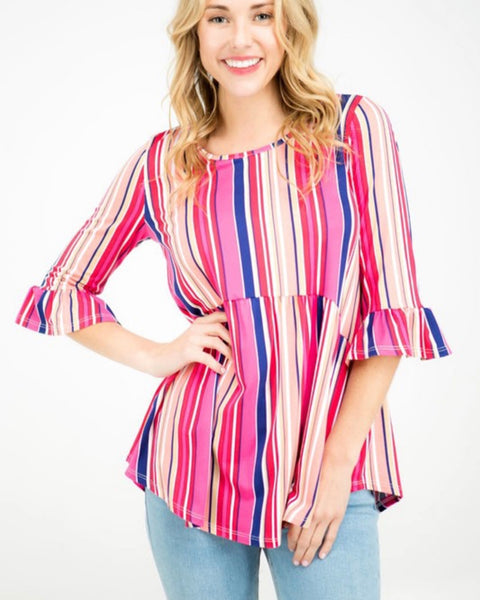 This three quarter length top is a piece of art. The sleeves have a great ruffled hemline. It has a peblum cut too. The multicolored stripes in coral remind us of brush strokes. This is such a great shirt. You won't want to miss it!