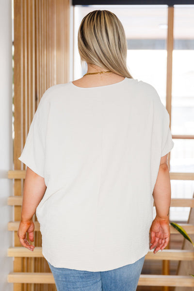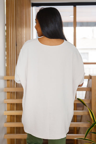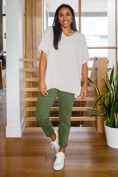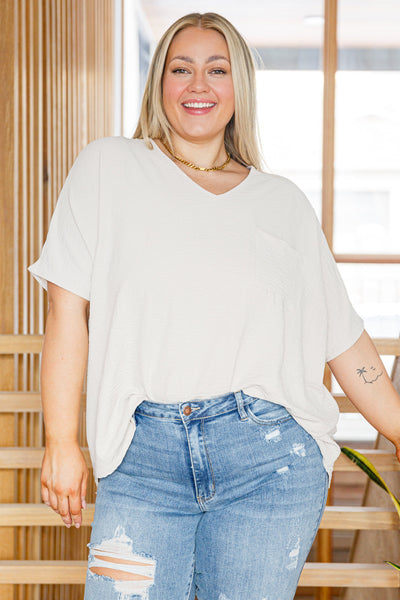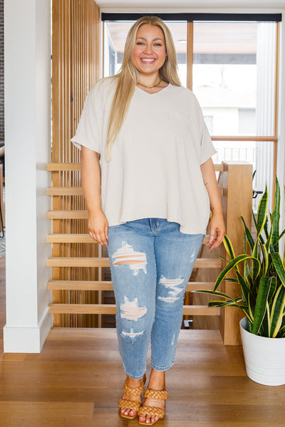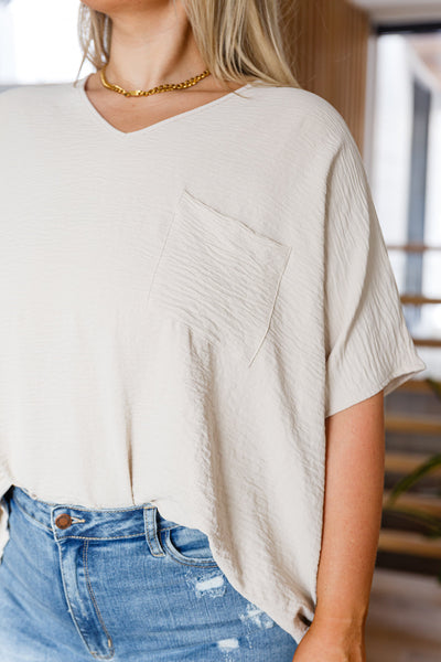 Get more bang for your buck with the Can't Help Myself Short Sleeve Tee in Sandy Beige! This budget-friendly-yet-stylish tee has an oversized fit, a flattering V-neck, dolman sleeves, and a chest patch pocket. Perfect for layering or wearing on its own. Stay stylish without breaking the bank with the Can't Help Myself Short Sleeve Tee!