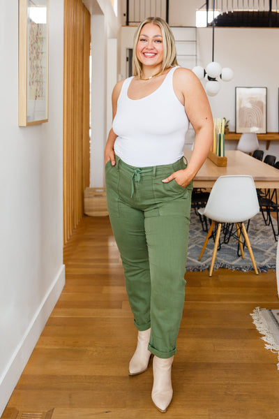 Get the best of both comfort and style with the stretchy and comfortable Carmen Double Cuff Joggers from Judy Blue! An elasticated waist, drawstring, zipper fly, and front and back pockets provide the function. The TO DIE FOR green color, flattering cut, and cuffed or uncuffed look take care of the form. Add these hi-waist joggers a versatile addition to your wardrobe before they’re gone!