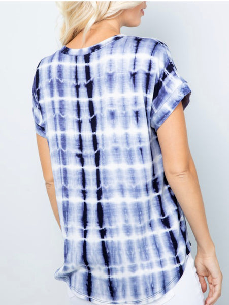 This tie dye top has a great stripe pattern. It's in a gorgeous shade of blue. We're loving this twist to a classic tie dye! It's going to sell out so fast! Don't pass this up!