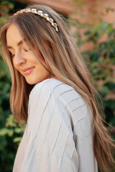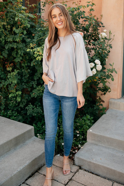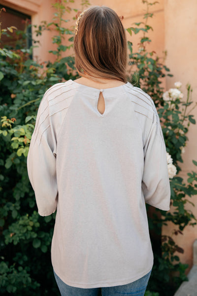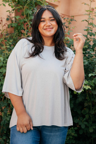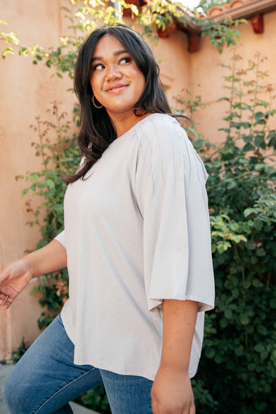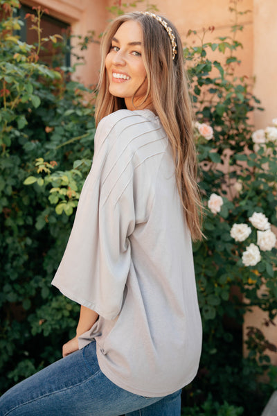 The Choir Of Angels Top is a beautiful silver blouse with pleated details at the shoulder. This top has a long, flowy silhouette and round neckline. Pair this with a skirt or dark skinny jeans for an elegant look.