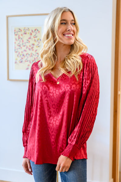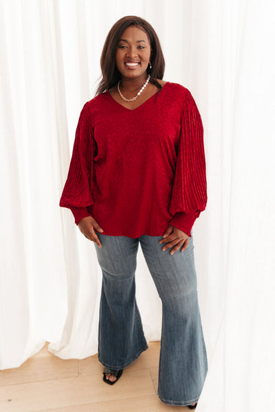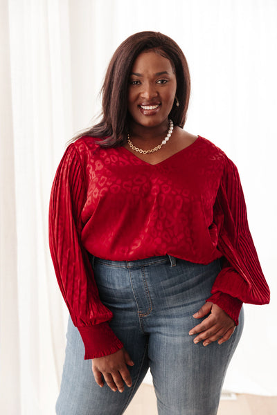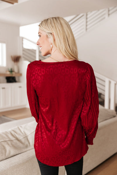 This romantic and chic top is absolutely stunning. It is in the most rich burgundy color, embossed with a subtle animal print that we know you'll fall in love with. An amazing pleated balloon sleeve with ruched cuffs and a slight v-neck shape this shirt. Pair it with jeans and heels or style with a mini skirt for the perfect date night outfit!