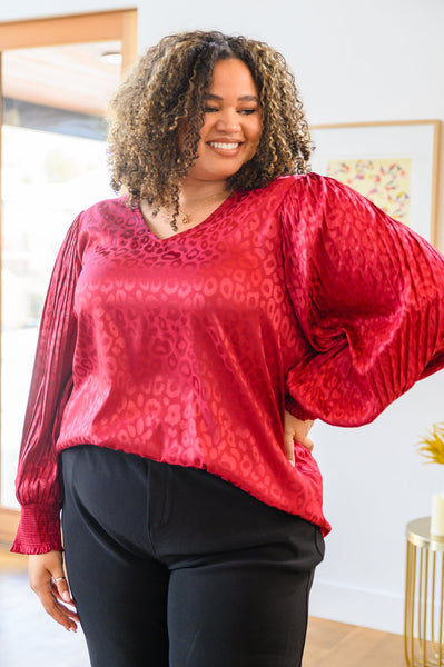 Keywords: Red, Balloon Sleeves, Pleats, Ruched, Animal Print, Blouse