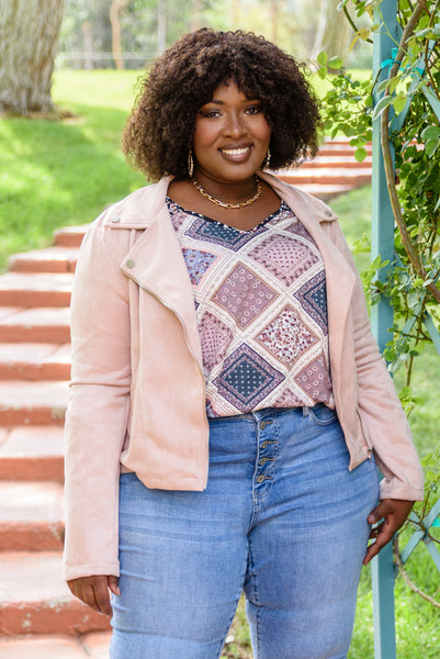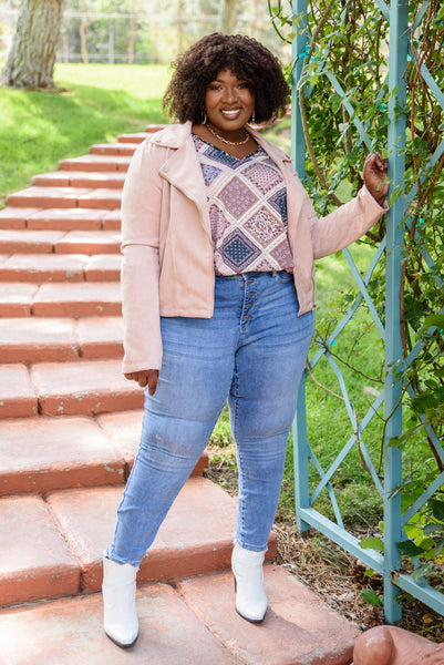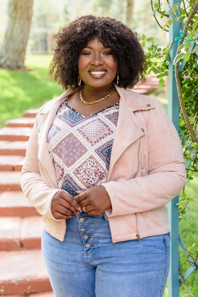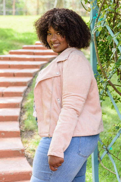 Take your style for a wild ride with the Clara Faux Suede Moto Jacket In Blush! A super soft faux suede shapes this jacket with a collared neckline, notched lapels, button detail, and long sleeves. An asymmetrical silver zipper and two zippered pockets accent the boxy bodice before ending at a slightly cropped hem.