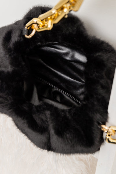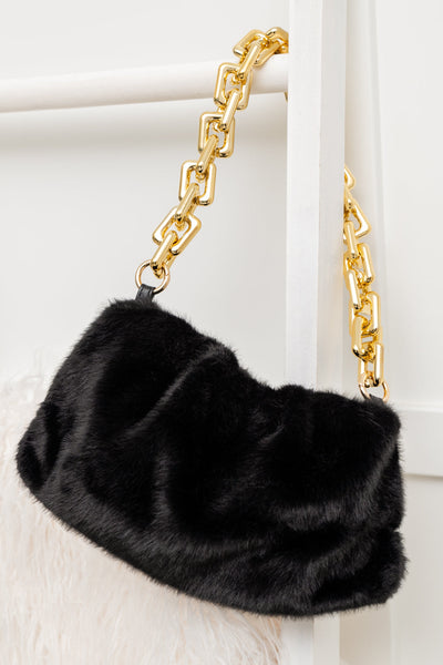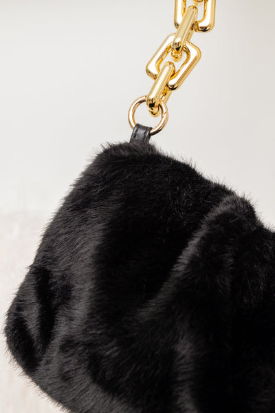 Score some extra style points with the Classy And Carefree Faux Fur Bag In Black! A shiny, gold metal chain link supports a rectangular style pouch lined in a faux fur. This perfect bag will take you from casual to formal occasions in style!