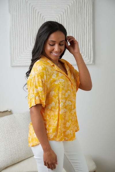 Stay comfortable and look sharp with this Clementine Floral Button Up Blouse. Crafted with premium cotton fabric, this top is lightweight and breathable, yet stylish enough dress up or dress down. With its classic collared design, short sleeves, and cheerful floral pattern, it's the perfect way to make a fashion statement this spring!