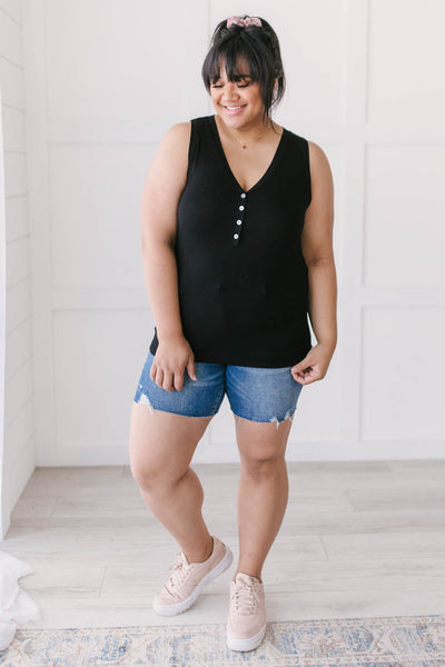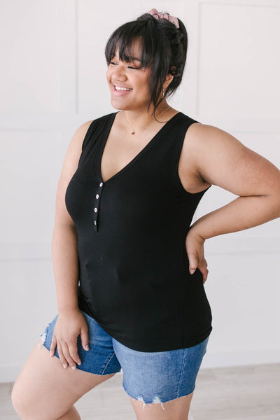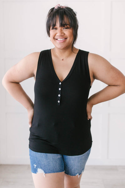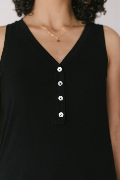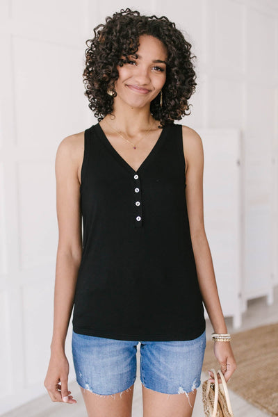 Don't be caught unprepared this summer by adding this staple item to your summer capsule wardrobe. This effortless lightweight tank features a henley-inspired design with button-up details at the V-neckline. Dress it up by pairing it with a silk skirt or dress it down with shorts and a pair of sneakers.
