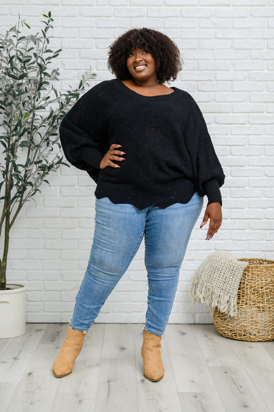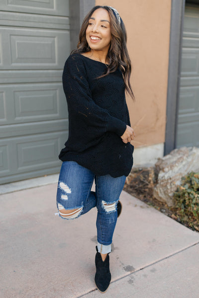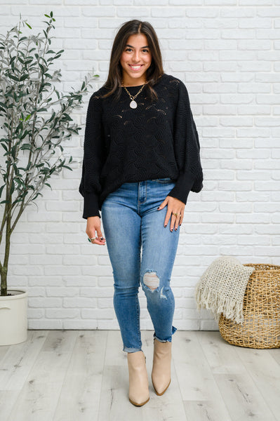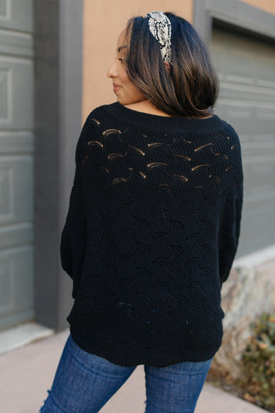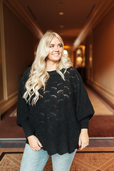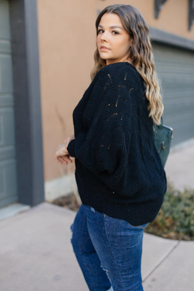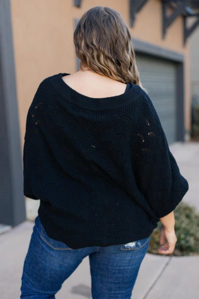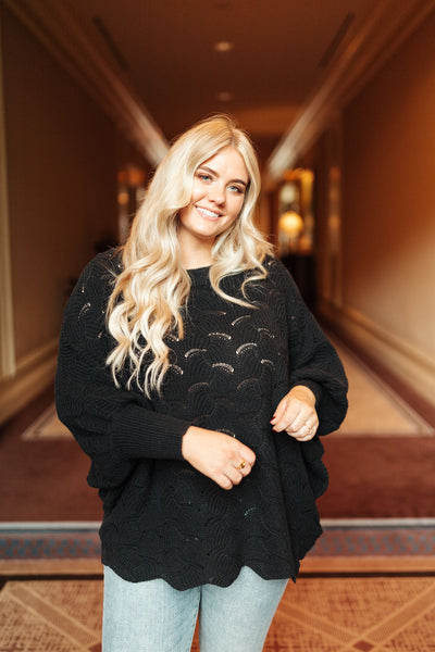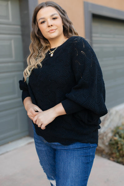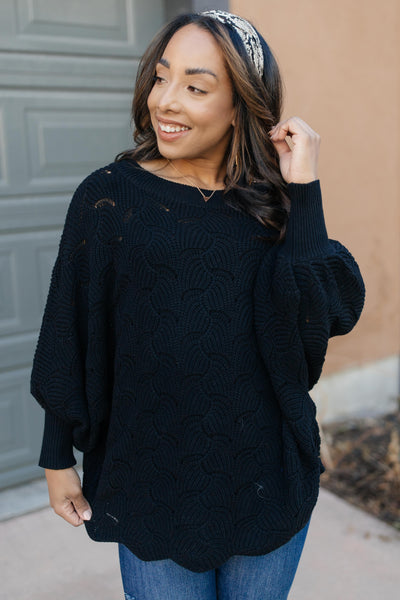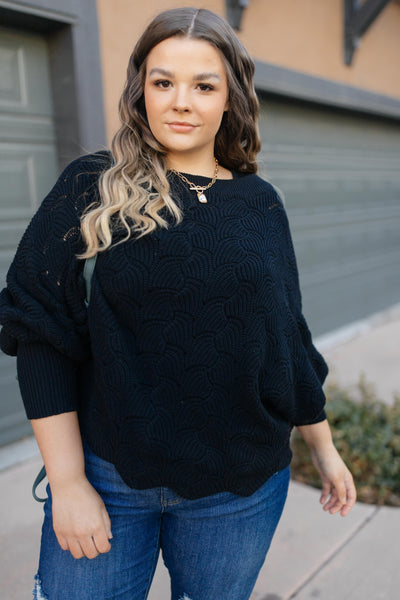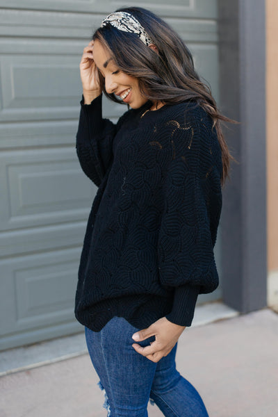 A sweater like this was meant to have details and a design that makes you fall in love with it! This top has a wide-cut rounded neckline and long slouchy sleeves. It also features a unique swirl patterned knit and is a lovely classy shade of black. It's a beautiful sweater that you'll feel trendy and confident in!