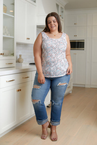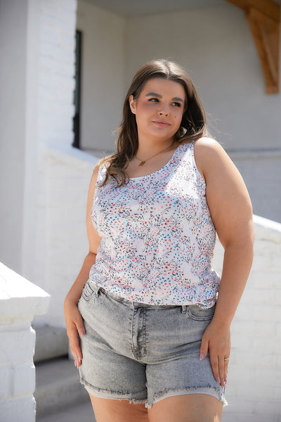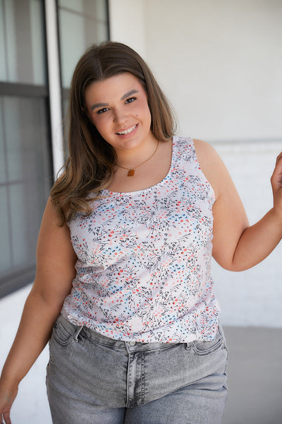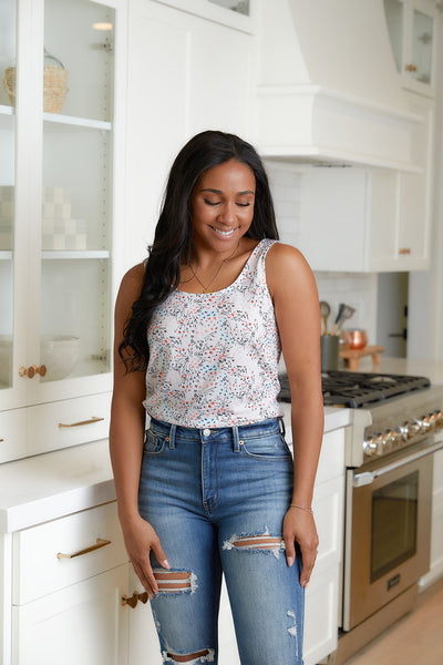 Be a vision of effortless femininity in the Evangeline Floral Cutout Tank! With a delicate ditsy floral print and half moon cutout, this breezy sleeveless tank will be a warm weather winner!
