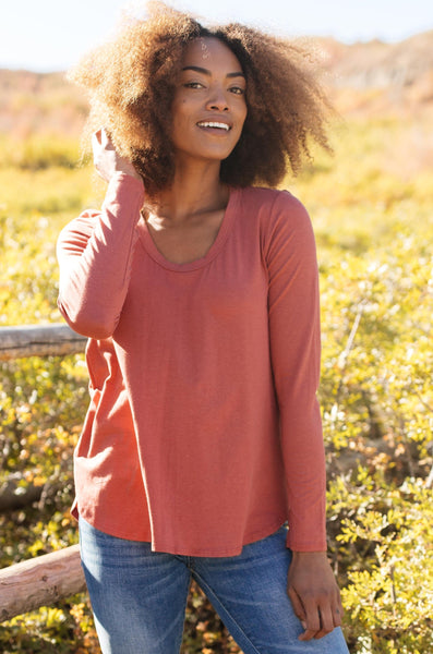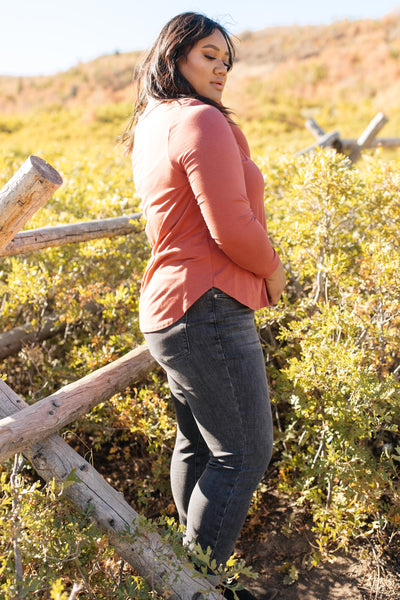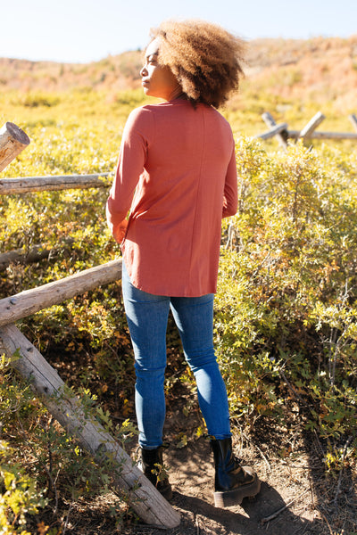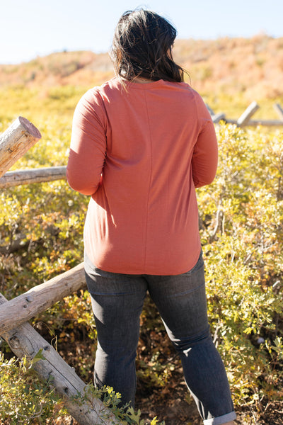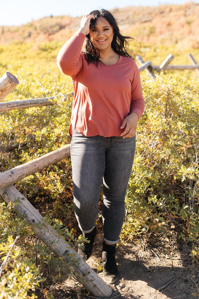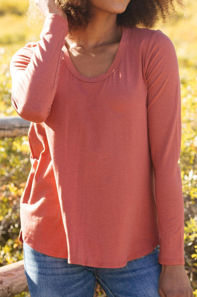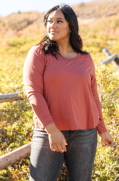 Every girl needs a really great basic top, and this one is sure to become your favorite quickly! This long sleeve shirt features a rounded neckline and is stretchy and lightweight, which makes it perfect for any way you want to layer it. Plus, it's the prettiest shade of brick you'll ever see!