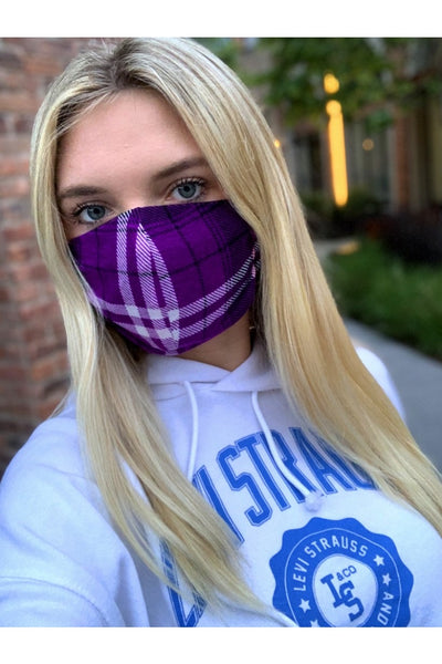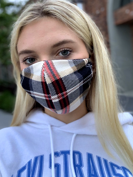 The masks are double layered: 100% cotton on the inside lining and 95% polyester/5% spandex material on the outside. Features an opening for option to place a filter in. Dimensions 5.5" x 7.5" with elastic ear loops.