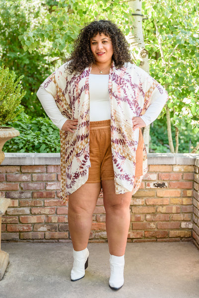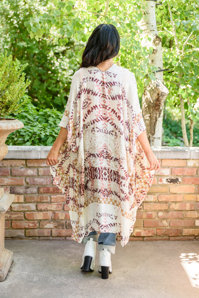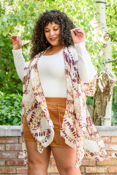 Just because summer is coming to a close, doesn't mean kimonos have to! The Finish My Story Kimono is the perfect layering piece to take with you into fall. With a classic kimono silhouette featuring high side slits and a stunning tie-dye geometric print, you're going to love this piece for years on end!