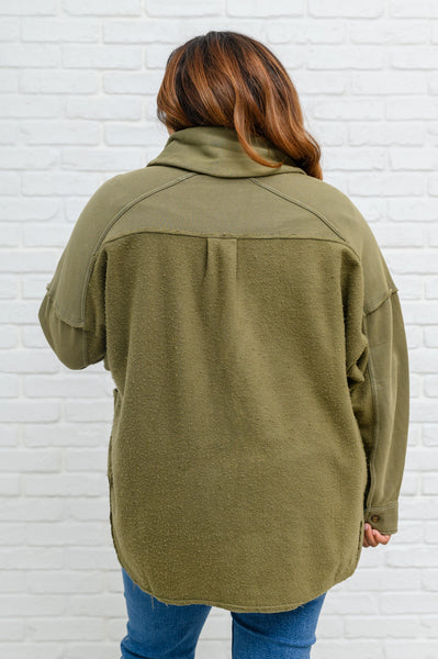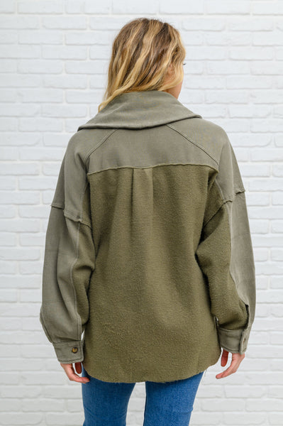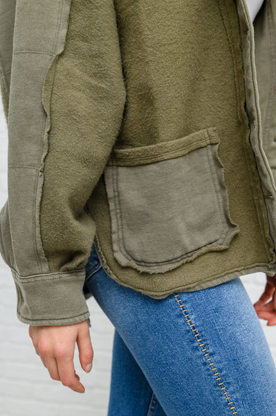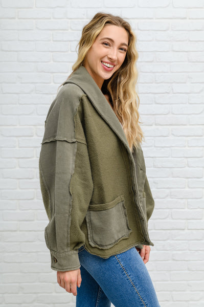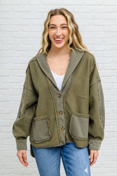 The French Terry Mineral Wash Jacket In Olive features an open front with functional buttons lining the bottom half with two front patch pockets and an oversized bodice. A contrasting fabric with raw hem detail lines the sleeves, pockets, and neckline. Oversized silhouette, hi-low hem.