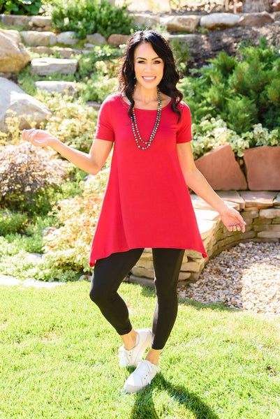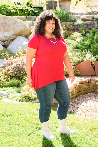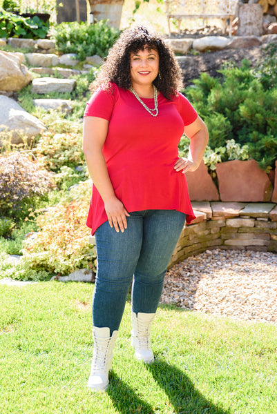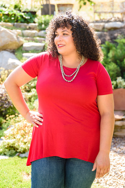 Serve up a simple yet stylish look in the Fresh Feels Top! Whether as a layering piece or on its own, this throw-on-and-go top shines with refreshing details. Featuring a round neck, a flowy A-line cut with a shark bite hem shaped from a lightweight stretchy, soft fabric! Pair with skinny jeans and combat boots for the perfect pre-fall look or wear with leggings and slip on shoes for ultimate comfort.