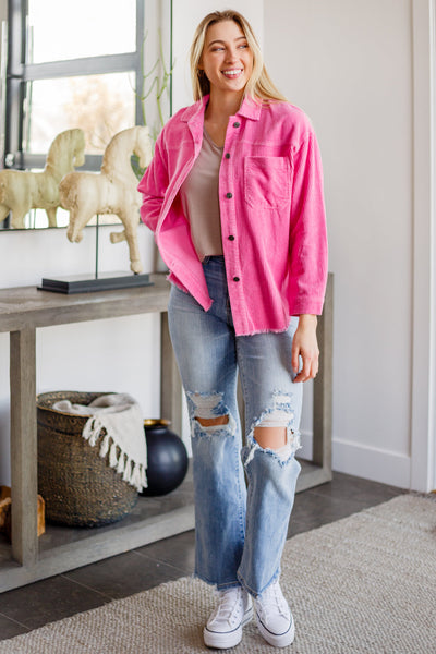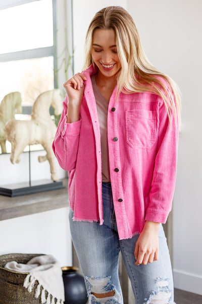 Adding pink to your wardrobe is always a good idea and The Friends To Lovers Corduroy Shacket is the perfect addition. This adorable shacket features a non-stretchy corduroy that shapes a collared neckline with a functional button placket that ends at a raw hem. Drop shoulder long sleeves frame the oversized bodice, finished off perfectly with button cuffs