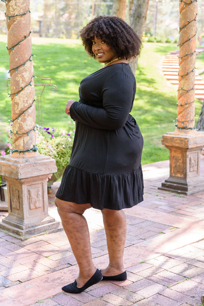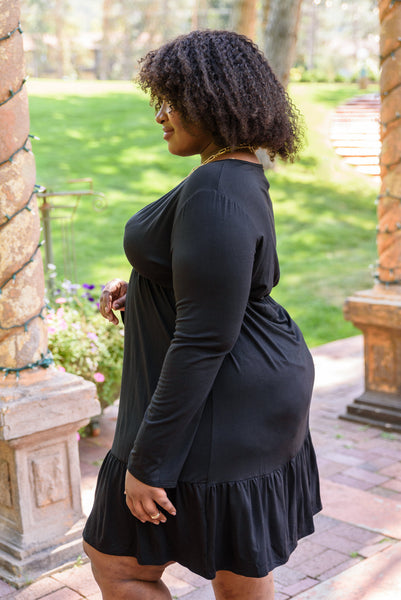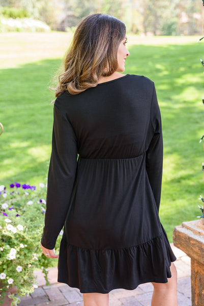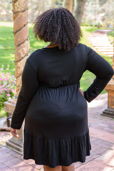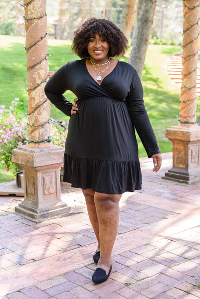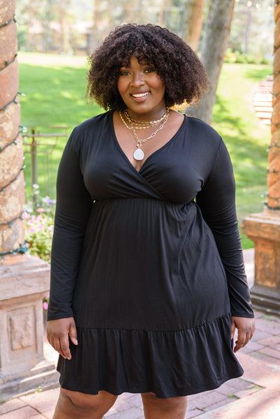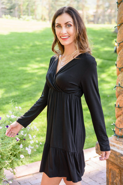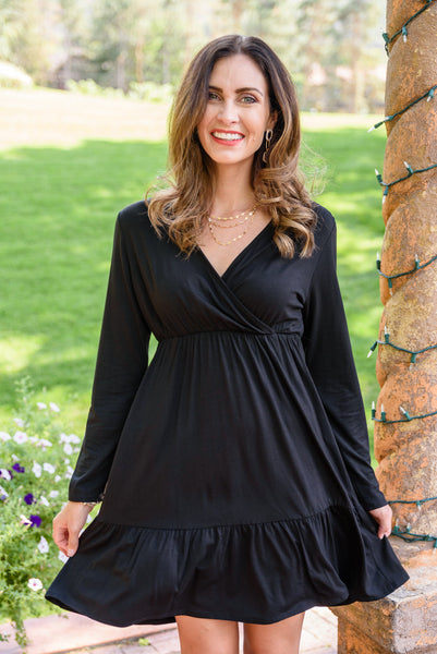 Twirl through the night in the Full Attention V Neck Long Sleeve Dress In Black! Featuring a surplice neckline thats falls into a flowy knee length skirt with a tiered hem and elasticated waist. Pair with knee high boots and a cozy cardi for the cutest look!