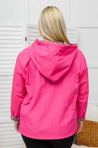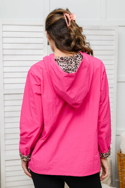 Throw on your sneakers with the Get Going Leopard Windbreaker in Pink and head out the door in style! This chic yet functional jacket features a hot pink, mid-weight windbreaker material with a contrasting animal print lining the hood and sleeves. A quart zip neckline with functional drawstrings tops a loose fit bodice, complete with front pockets and adjustable elastic bands.