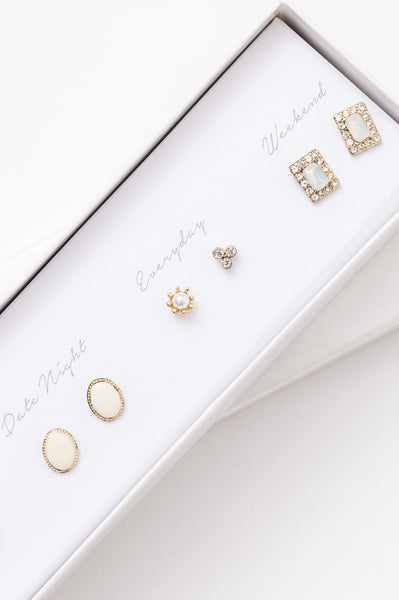 Glamorously You Box Earring Set has you covered for all your events! Featuring a five pack set of gold earrings each designated to a specific outing whether it's everyday wear, GNO, date night or the weekend, this earring set is here for you!