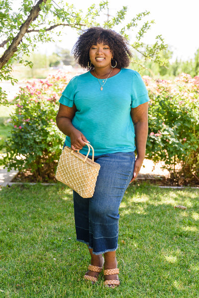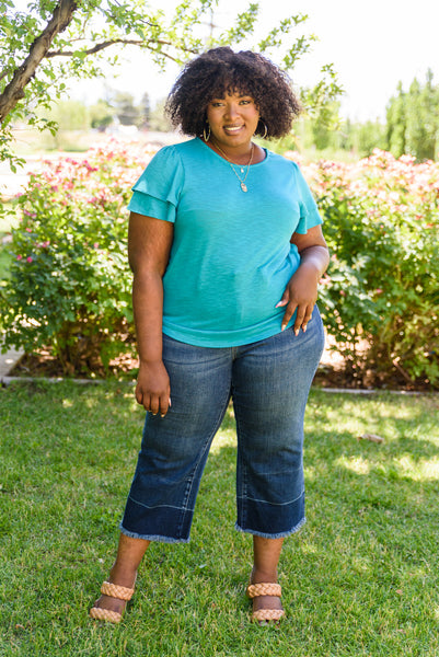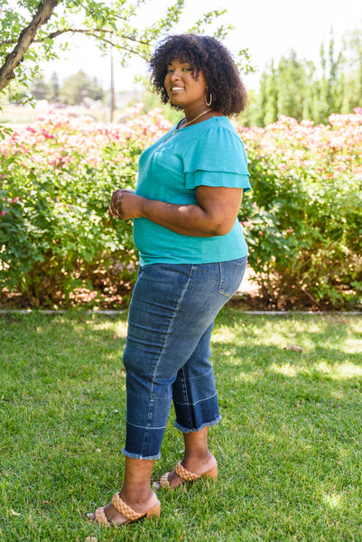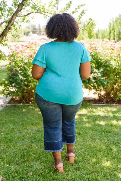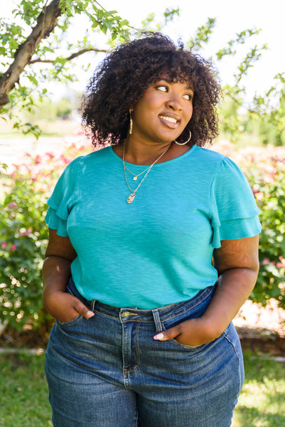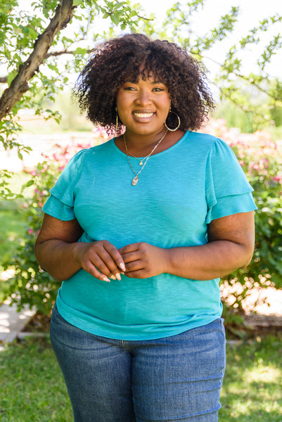 Stay in style with the Go With The Flow Top! A stretchy, lightweight heathered teal fabric shapes a round neckline, layered ruffle sleeves, rounded hem, and flowy silhouette. Pair with wide leg jeans, heeled sandals and a wide brim hat for the perfect summer boho look!