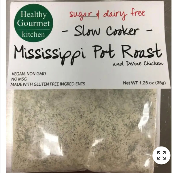 Mississippi Pot Roast- If you haven't made Mississippi Pot Roast yet you are in for a treat. Super easy and fast prep and so delicious. Our version is a bit healthier with no added sugar, preservatives or dairy. Also included is our premium poultry seasoning blend and a recipe to make Divine Chicken in the slow cooker without relying on canned soup.