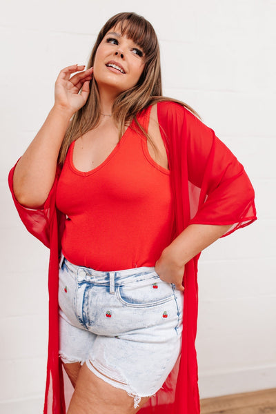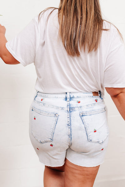 A backyard pool party starts with the Hi-Waisted Cherry Acid Wash Cutoffs! These cute shorts feature a stretchy acid wash denim decorated in mini cherry embroidery, a hi-waist, distressed hem, and five pocket cut. Pair with your bikini top and sandals for a cute poolside look!