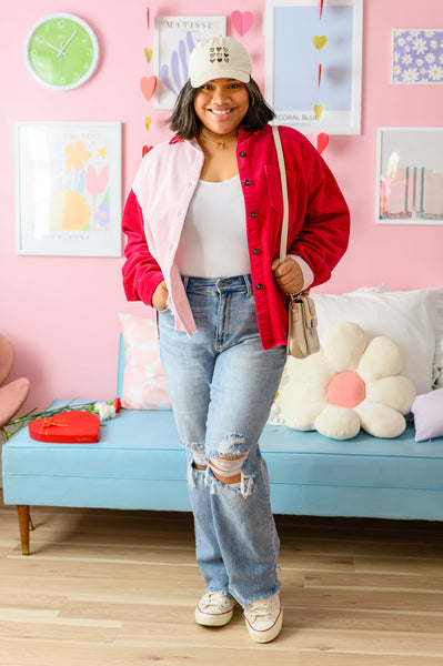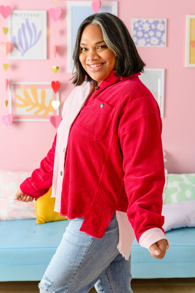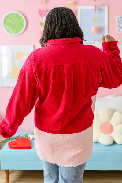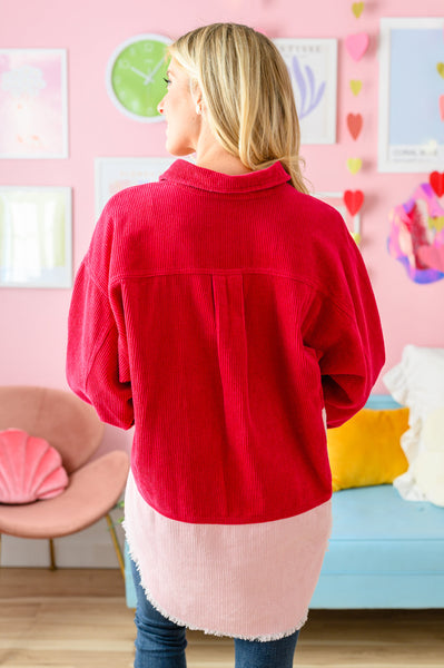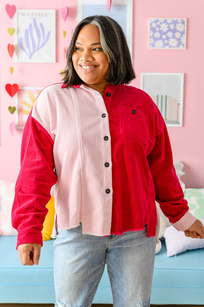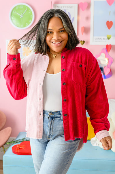 Create the cutest looks in the Hold My Hand Shacket! This adorable shacket features a non-stretchy corduroy that shapes a collared neckline with a functional button placket that ends at a raw, uneven hem. Drop shoulder long sleeves frame the oversized bodice, finished with button cuffs. The colorblock design and hi-low hem detail add a refreshing touch to your classic shacket!
