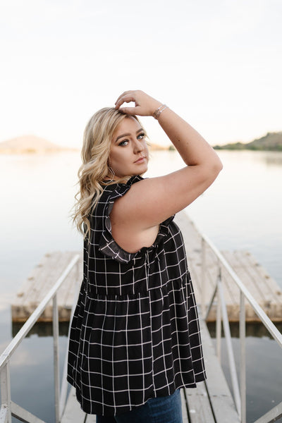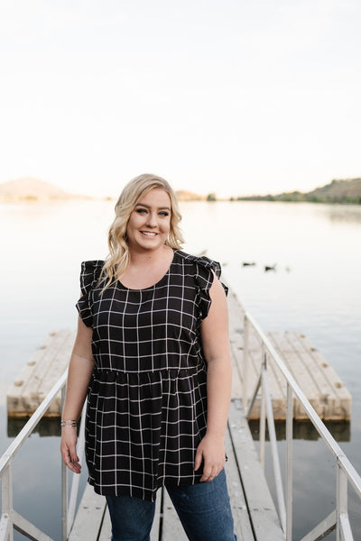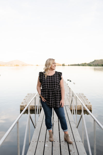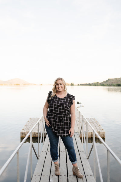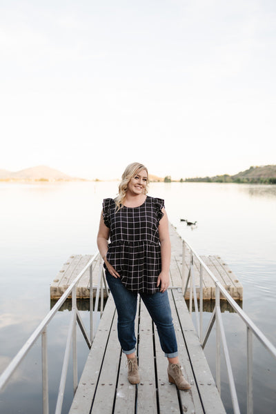 Dreamy and romantic, this adorable little baby doll blouse checks all the boxes on what to wear on the perfect date night. We were loving this with our non distressed Judy Blues and taupe chunky heels.