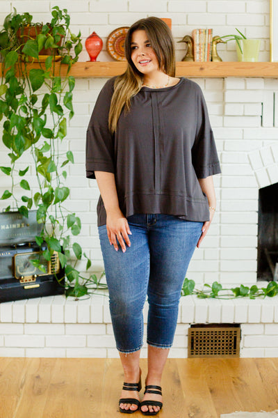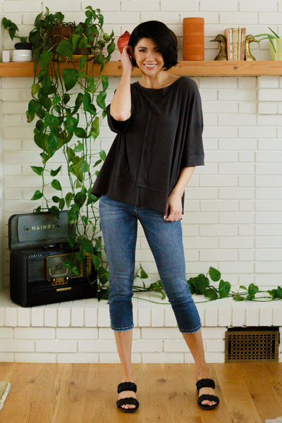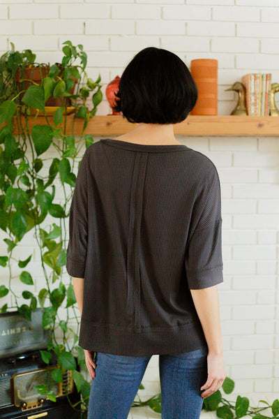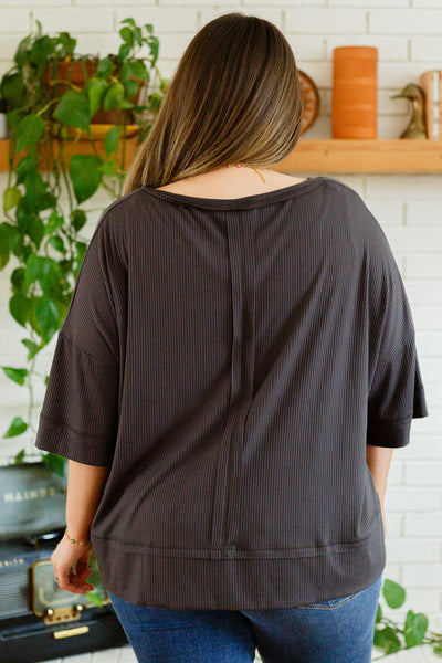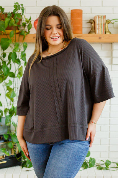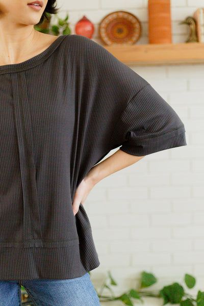Toss on the I'll Never Forget Ribbed Dolman Sleeve Top for the comfiest on the go look! A stretchy ribbed knit shapes a boat neckline with dolman three quarter sleeves and an oversized bodice. Center front seam detailing.