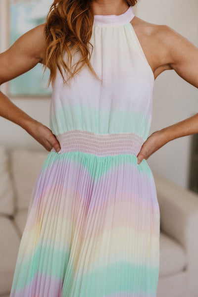 Discover an enchanting look with the Irresistibly Iridescent Maxi Dress. Beautifully adorned with an ombre rainbow stripe, this chiffon dress features an accordion pleated skirt, pockets, and a halter neckline. Look and feel your best with this dazzling and irresistible maxi dress!