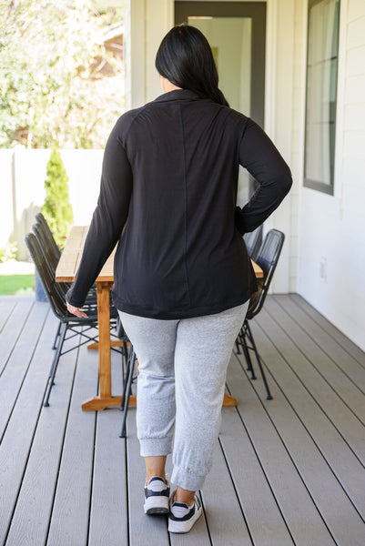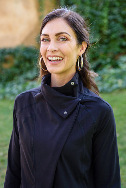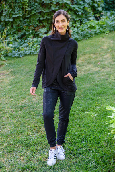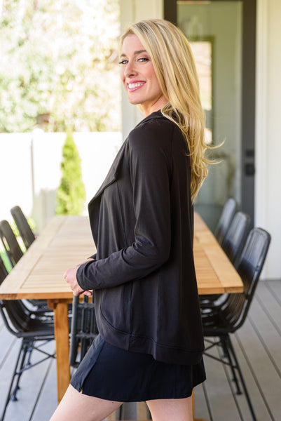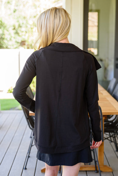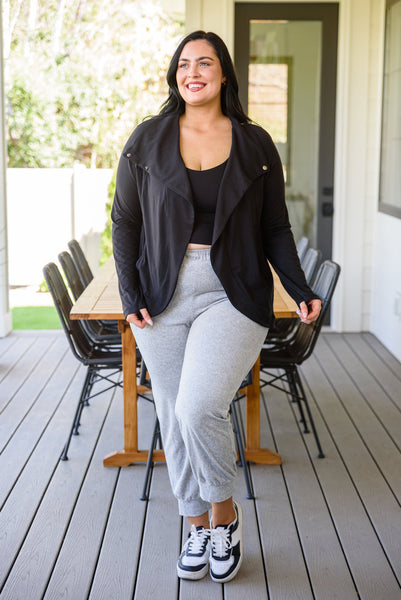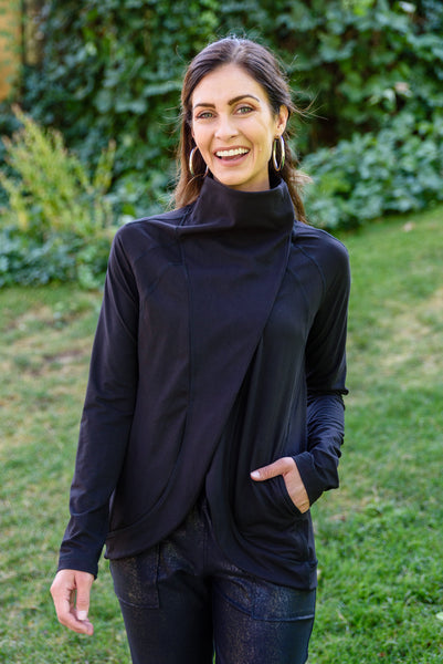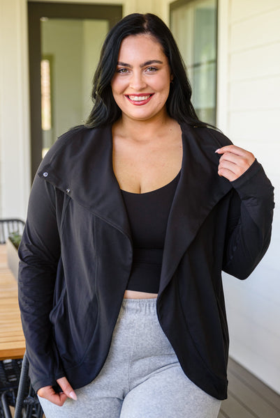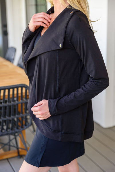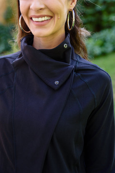 We couldn't dream up a better jacket than the Janie Asymmetric Cowl Neck Jacket In Black! An open front that can close with a snap button detail at the neck creates an asymmetric cowl silhouette dropping into a rounded hem with long sleeves finished with thumb holes and decorative seams throughout. Pair this stylish yet functional jacket with your favorite leggings and sneakers for a sporty chic look!
