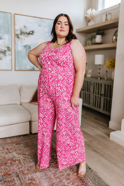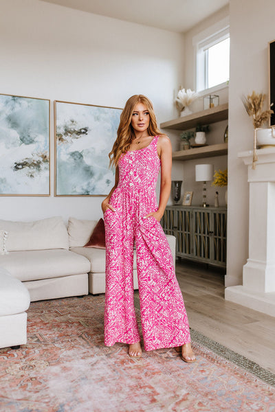 Step out in this comfy-cozy Just Think About It Jumpsuit! Featuring a tank-style top, decorative buttons, and pockets, this wide leg jumpsuit is made from a jersey knit, and comes in a bright pink with white florals that'll turn heads!