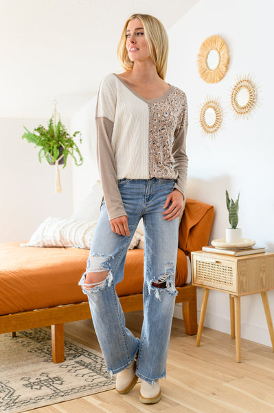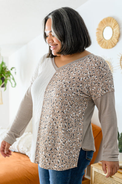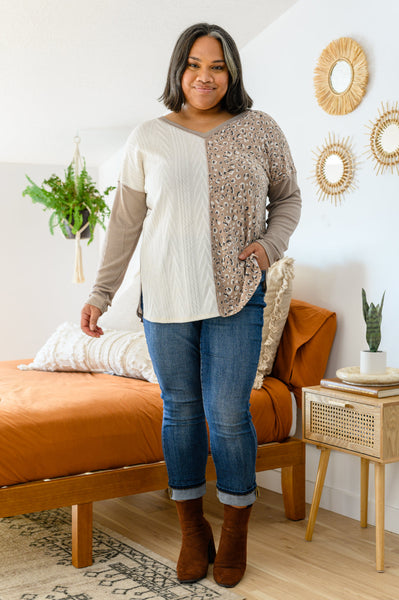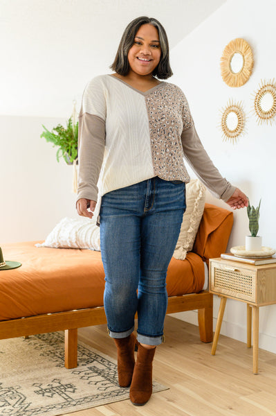 As long as you have the Keep Me Longing Animal Print Long Sleeve in your closet you'll be a happy girl! This fun top features contrasting knits and prints with a v-neckline, drop shoulder long sleeves, and a loose fit bodice! Perfect for wearing on its own or layered with a denim jacket!