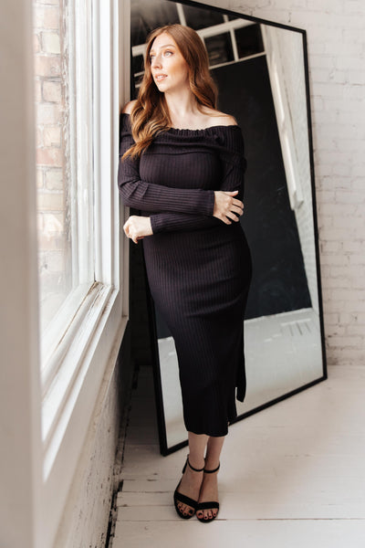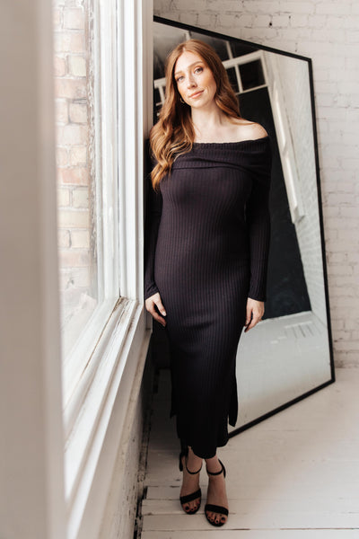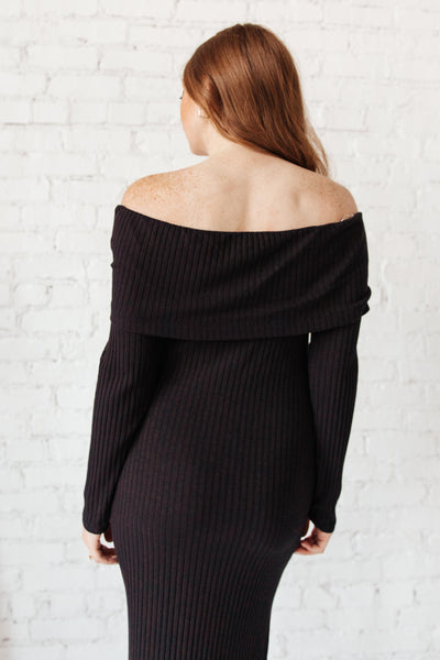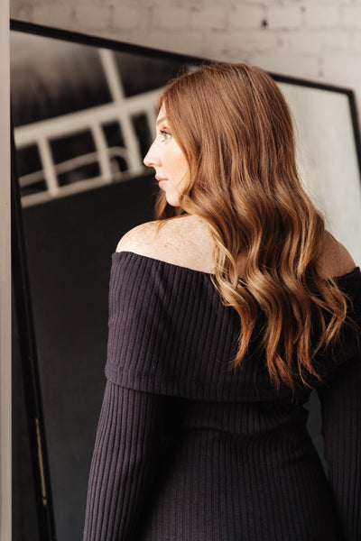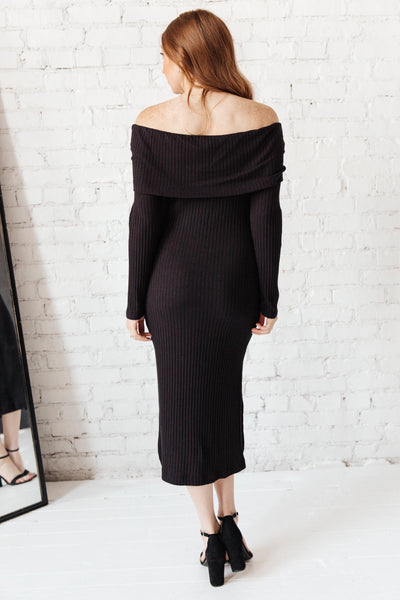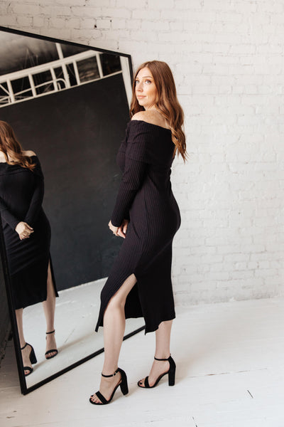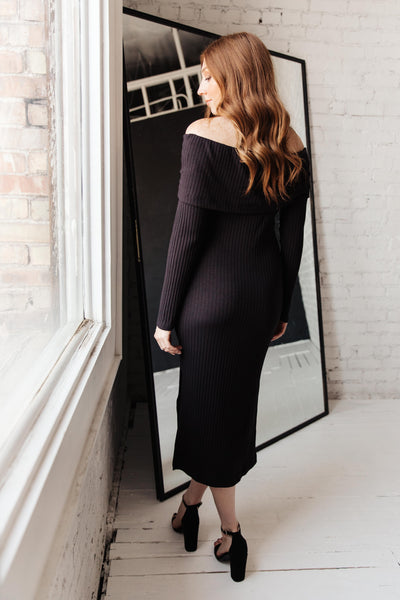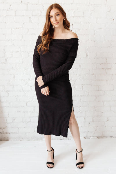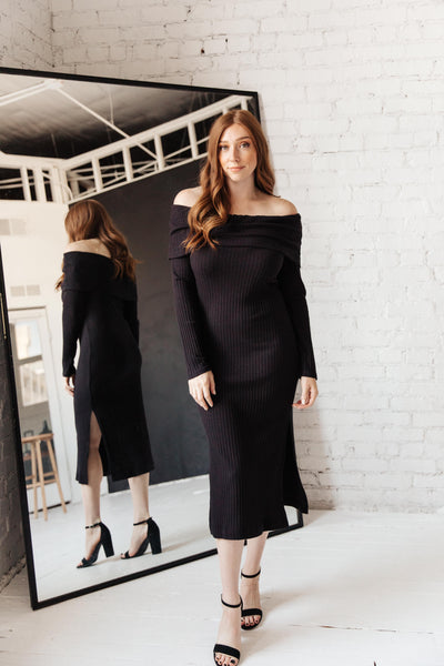 The Kiah Sweater Dress In Black is simply stunning! This dark colored body con dress is made from a soft stretchy fabric that makes this form fitting dress comfortable to wear. We absolutely love the fold-over neckline that brings attention to your shoulders! Pair this dress with heels or ankle boots.