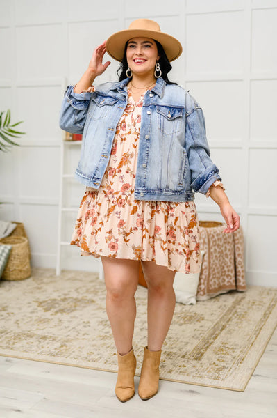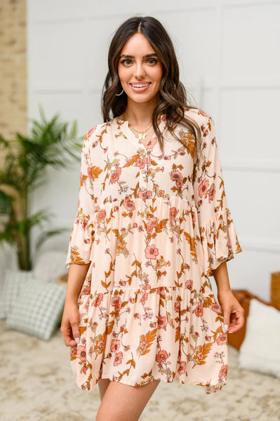 Be day date ready in the Lilibet Tiered Floral Dress. This adorable dress features a gauzy, non stretch fabric decorated in dainty pink and rust flowers throughout. A round neckline with notched detail falls into a two tiered mini skirt that supports three quarter bell sleeves.