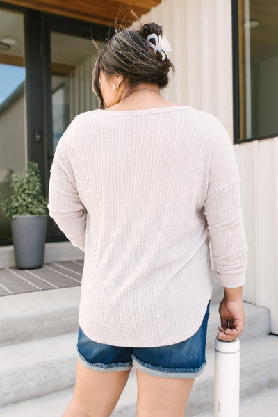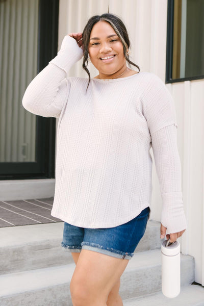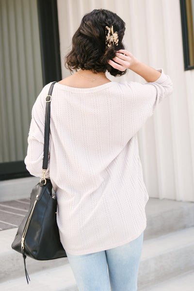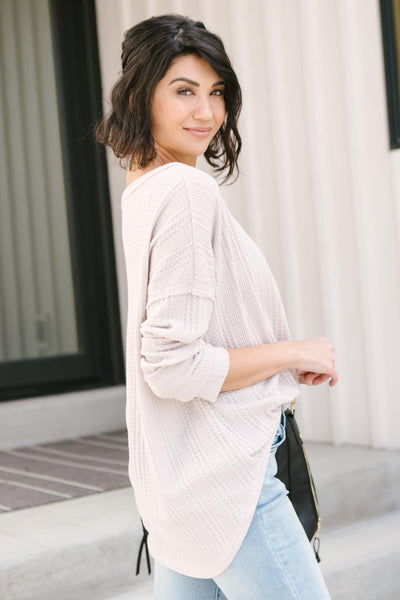 If you've been needing a flawless transitional top to add to your closet, this one is it! It is a beautiful waffle knit material in gray that is perfect for every season. It is lightweight and easy to throw on for anything. Reach for this one to wear to the beach or your local farmer's market.