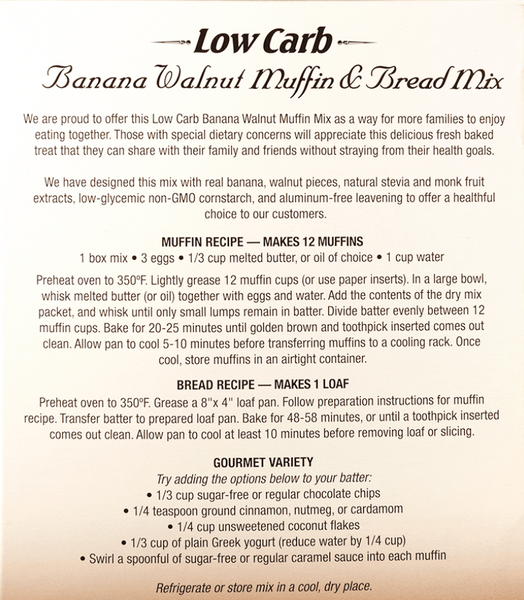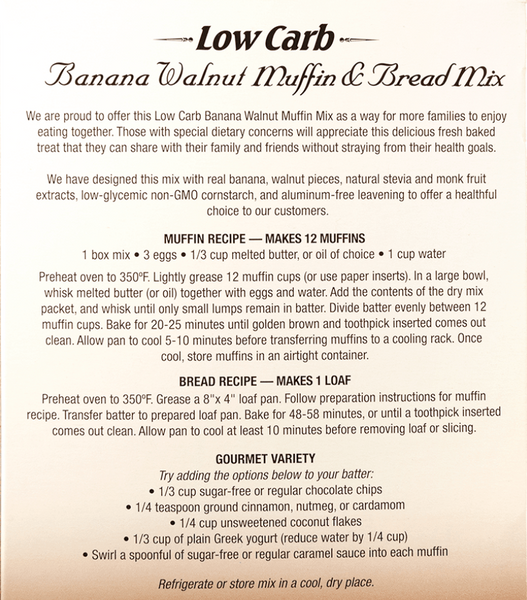 We are proud to offer this Low Carb Banana Walnut Muffin Mix as a way for more families to enjoy eating together. Those with special dietary concerns will appreciate this delicious fresh baked treat that they can share with their family and friends without straying from their health goals. We have designed this mix with real banana, walnut pieces, natural stevia and monk fruit extracts, low-glycemic non-GMO cornstarch, whole grain oats, and aluminum-free leavening to offer a healthful choice to our customers.