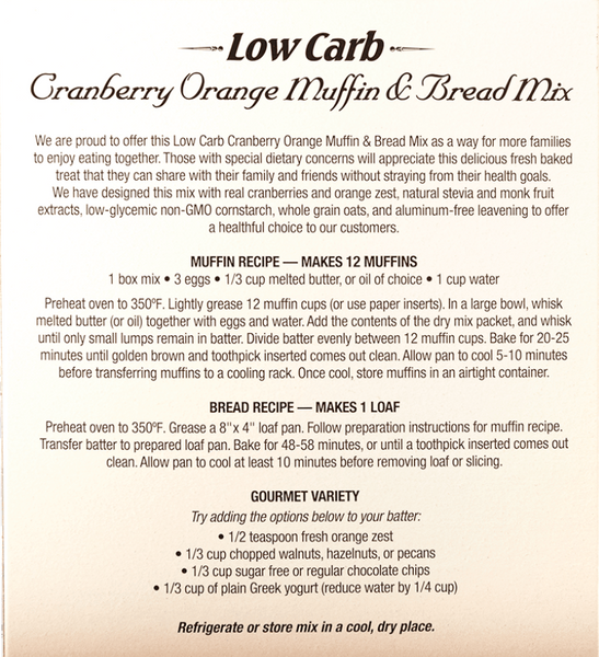 We are proud to offer this Low Carb Cranberry Orange Muffin & Bread Mix as a way for more families to enjoy eating together. Those with special dietary concerns will appreciate this delicious fresh baked treat that they can share with their family and friends without straying from their health goals. We have designed this mix with real cranberries and orange zest, natural stevia and monk fruit extracts, low-glycemic non-GMO cornstarch, whole grain oats, and aluminum-free leavening to offer a healthful choice to our customers.