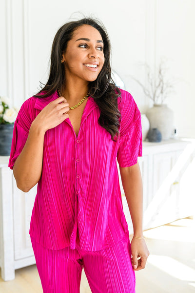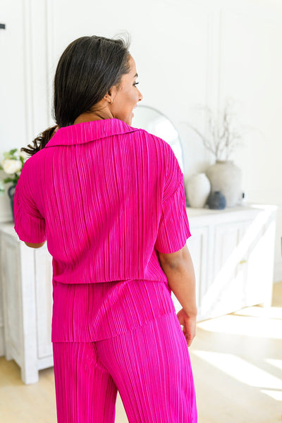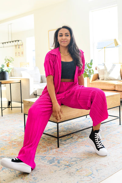 Be effortlessly stylish and comfortable with the Low Key Perfect Plisse Set. This comfortable set features a button down collared top paired with wide leg pants with an elastic waistband all in a silky plisse fabric. Ready for a night out, or for curling up for a cozy night in? Experience comfort and class with this must-have set!