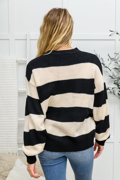 The Lucky Strike Top In Black Stripe features a medium weight knit that shapes a round neckline with a drop shoulder detail and long sleeves. A black and cream striped design lines the entire sweater.