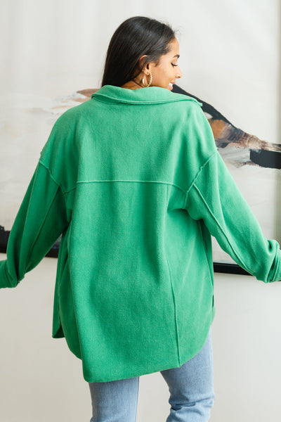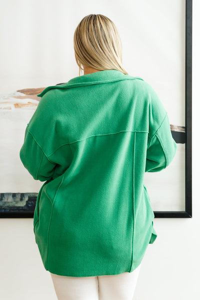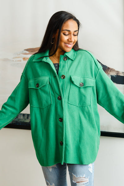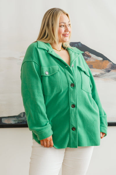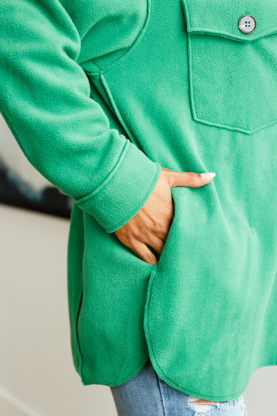 The Meet Me Halfway Shacket in Green is a must-have for your wardrobe. With a functional button front, collared neckline, and front flap pockets, this shacket is both stylish and practical. The side pockets and button cuffs add to its functionality, while the relaxed fit and medium weight fleece fabric make it both comfortable and warm. The stretchy material and KKGC (Killer Kelly Green Color) make it a perfect choice for both casual and dressy outfits.