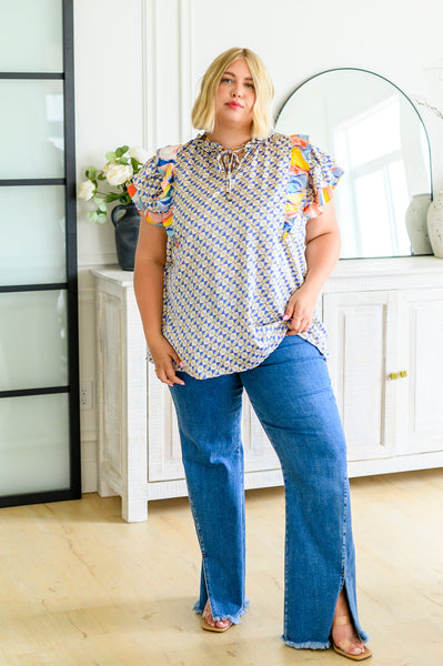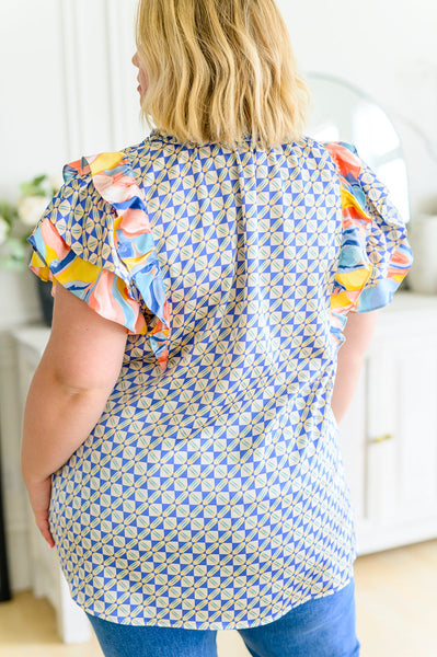 Bring fun and flirty style to your wardrobe with the Merry Go Round Flutter Sleeve Top. Crafted from silky, woven fabric, it features a mix of bold prints, a self-tying keyhole neckline, tiered flutter cap sleeves and a ruffled neckline for a romantic twist. Spice up your casual outfits with this stylish top!