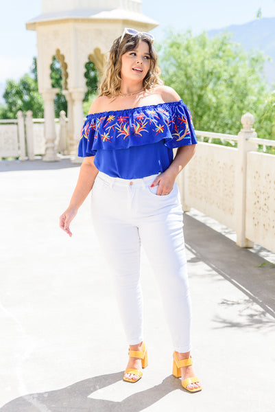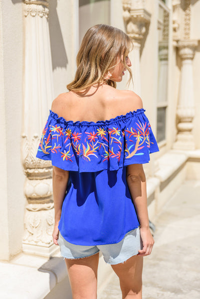 The Mirabella Embroidered Top is the perfect piece for all your vacation photo-ops! The amazing details will truly make your picture pop! Featuring an off-shoulder elasticized neckline, with ruffle overlay and colorful embroidery that tops a boxy silhouette and finished in an amazing royal blue color!